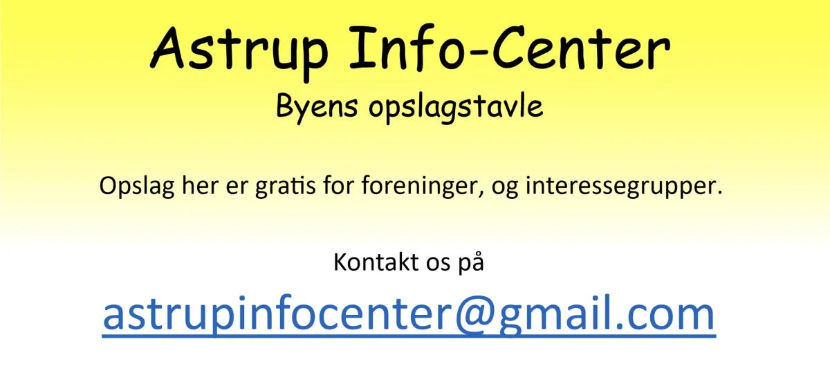Hvis du gerne vil orienteres om nye opslag der bliver slået op på Info skærmen i Brugsen i Astrup, så er det muligt løbende at modtage en mail med en kopi af de nye opslag.